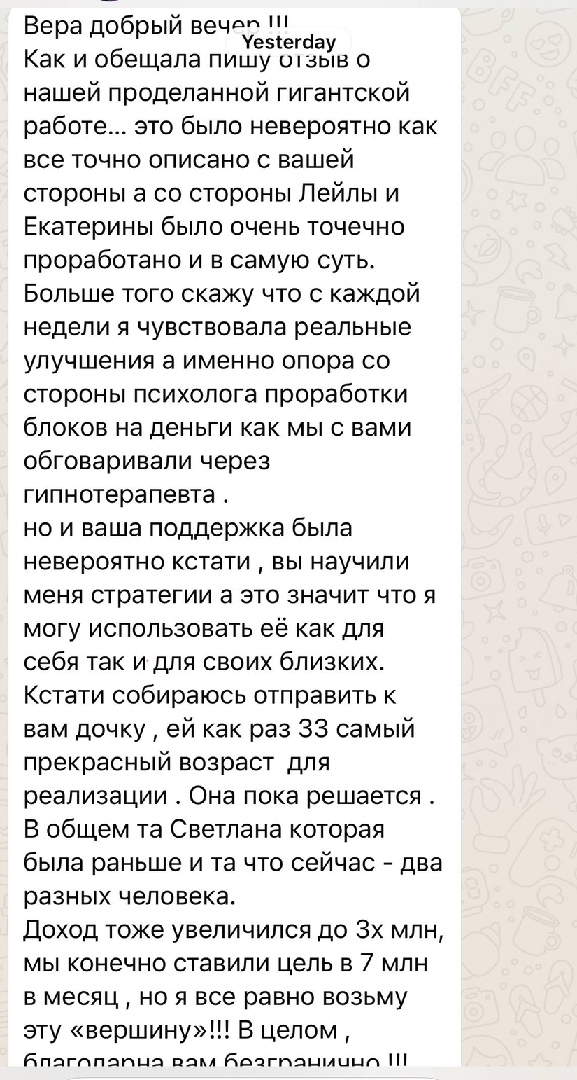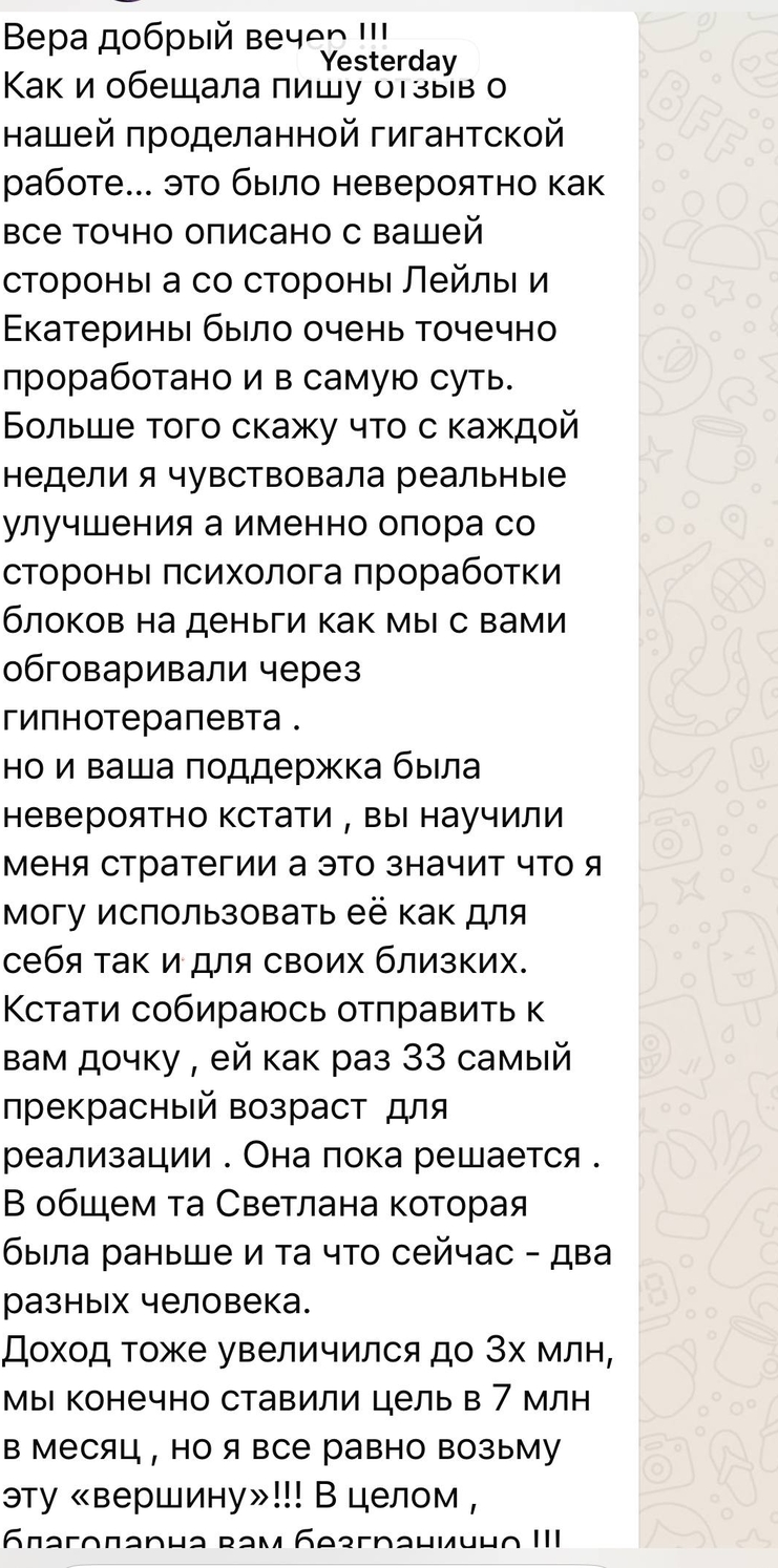 Сегодня я применяю системный подход в работе с людьми: помогаю прийти к своей реализации и предназначению, выстроить внутреннюю опору, что напрямую влияет на уровень дохода, решений и качества жизни. Моя работа — это соединение структуры, психологии и глубинного понимания личности.